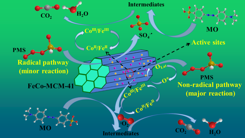 基于过一硫酸盐(PMS)及过二硫酸盐(PDS)的高级氧化技术具有氧化能力强、适用pH范围广、药剂储运方便等优势,已成为水污染治理领域的前沿热点课题。近年来,围绕过硫酸盐氧化技术的研究不断深入,其难点是开发出反应活性高、结构性能稳定且可回收利用的催化剂激活PMS/PDS产生具有较高氧化能力的活性氧物种。为此,本团队通过一锅法合成了MCM-41限域铁和钴双金属催化剂,由于金属高度分散以及铁钴之间的协同作用,在活化PMS降解甲基橙模拟染料废水的过程中表现出优异的活性和稳定性。同时,利用电子自旋共振实验对反应过程活性氧物种进行了鉴别,并结合产物分析提出了甲基橙降解路径。