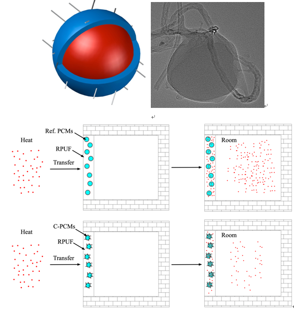 文中作者将具有高导热效果的碳纳米管嵌入在相变微胶囊囊壁中,使其作为“桥梁”沟通微胶囊内外热量的传递。制备出的相变微胶囊(C-PCM)的相变起止温度相比普通相变微胶囊降低了0.5℃,更加接近相变材料裸材的变化温度。自制的小室模型测试表明,添加了C-PCM的墙壁对温度变化更加敏感,对室内温度有更好的调节作用。本工作在提高建筑节能方面具有良好的应用前景,也为微胶囊壁材设计提供了方案。