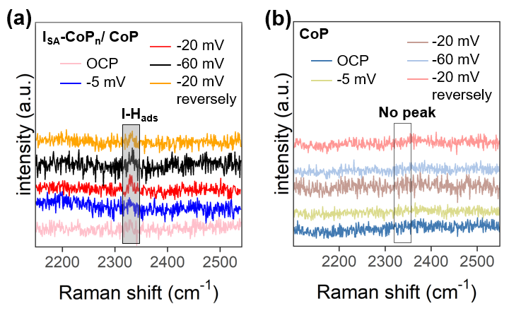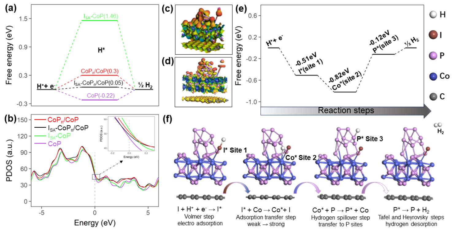 经过研究,ISA-CoPn/CoP催化剂的优异性能可以归因于ISA和富P的CoPn纳米团簇在CoP基底中表现出的独特协同效应。ISA和富P的CoPn纳米团簇可以优化H在CoP体系中的吸附能,加速HER在CoP体系中的动力学过程。原位拉曼测试直接观察到中间I-H键振动峰,表明ISA掺杂直接参与了H+还原的Volmer步骤。同时,密度泛函理论(DFT)计算表明,富P的CoPn纳米团簇由于其接近于零的氢吸附能(-0.12eV)而成为优秀的H脱附中心,有助于Heyrovsky和Tafel步骤。本研究为ISA掺杂CoP基催化剂的设计提供了新的思路。