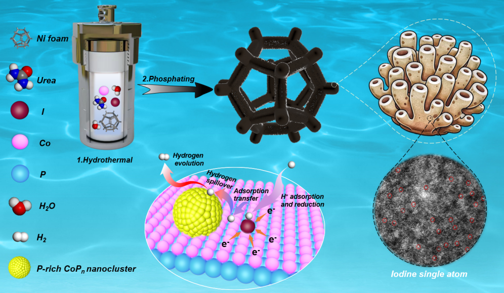 课题组通过碘单原子(ISA)掺杂磷化策略成功制备了新型ISA掺杂的富磷磷化钴团簇@CoP基底的珊瑚管状析氢催化剂(ISA-CoPn/CoP)。该催化剂首次将ISA和富P的CoPn纳米团簇掺杂于磷化钴基底中,ISA-CoPn/CoP表现出了优异的析氢性能,在0.5 M H2SO4溶液中表现出仅44和81 mV的低过电位,以驱动10和100 mA cm-2电流密度。此外,其Tafel斜率(41.2 mV·dec-1)也远低于纯CoP(84.4 mV·dec-1)。