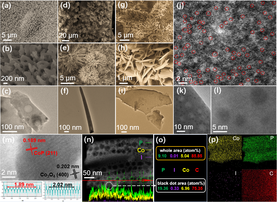 课题组通过碘单原子(ISA)掺杂磷化策略成功制备了新型ISA掺杂的富磷磷化钴团簇@CoP基底的珊瑚管状析氢催化剂(ISA-CoPn/CoP)。该催化剂首次将ISA和富P的CoPn纳米团簇掺杂于磷化钴基底中,ISA-CoPn/CoP表现出了优异的析氢性能,在0.5 M H2SO4溶液中表现出仅44和81 mV的低过电位,以驱动10和100 mA cm-2电流密度。此外,其Tafel斜率(41.2 mV·dec-1)也远低于纯CoP(84.4 mV·dec-1)。